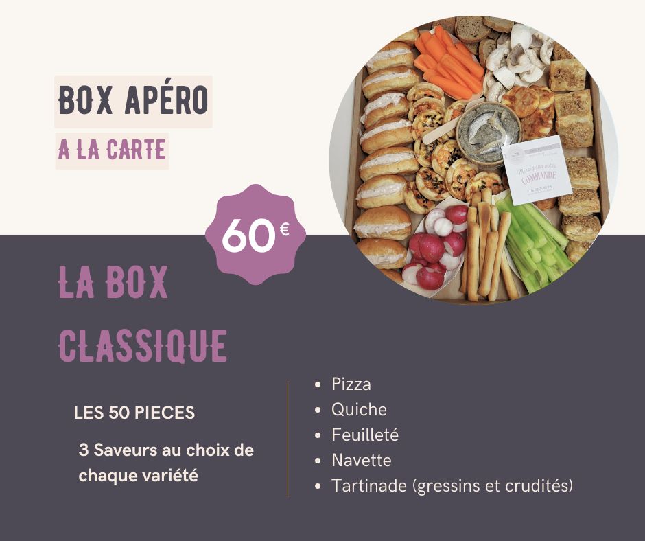 Cette box apéritive traiteur est composée de pièces salées réalisées à partir de produits frais et de saison.